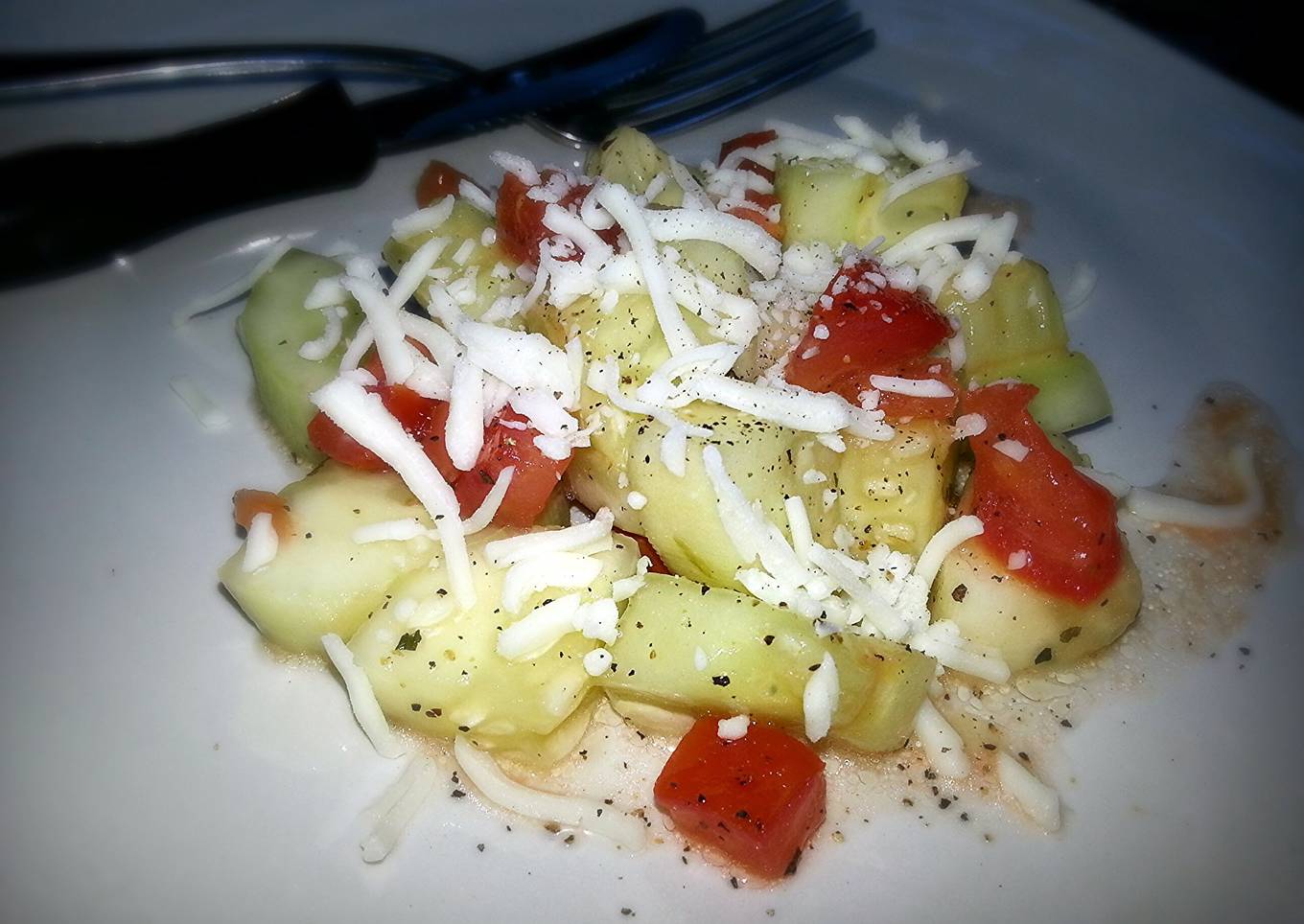 - Serve salad with freshly ground pepper and sprinkle a bit of mozzarella cheese on top (however much you prefer - I use about a tablespoon on each serving) Enjoy : )