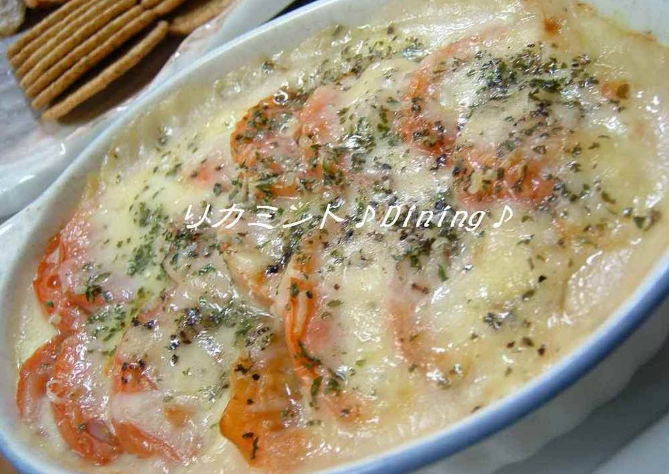 I like cooked tomatoes, so I often make tomato and cheese bake. I wondered if it would be tasty if I added white sauce to the dish first, so I gave it a try. It was good, so I uploaded the recipe. You can use grated cheese if you don't have any Parmesan It's also nice with mozzarella instead of melting cheese. The dish is easy to make because it uses canned white sauce. Recipe by Rikaminto
