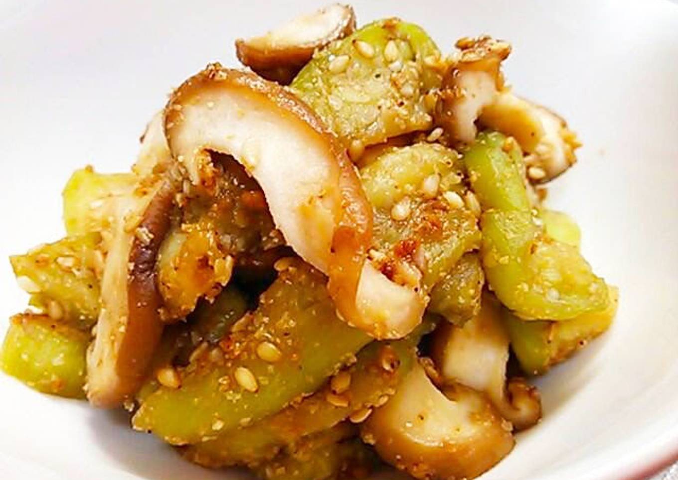 - Lightly wring out the excess moisture from the eggplant and shiitake, then add the sesame sauce. Don't add it all at once, but add a little at a time to adjust the taste.