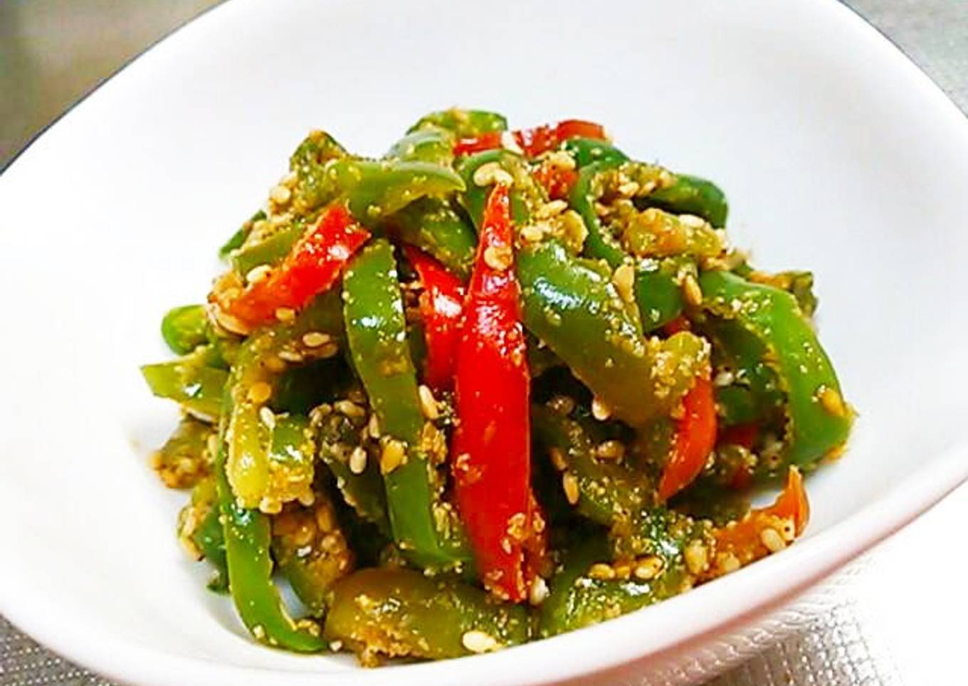 - Shake off excess water from the bell peppers, then toss with the sesame sauce, adding it gradually until you reach your desired taste.